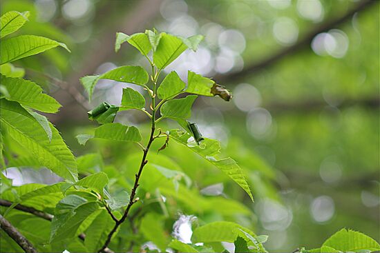 見上げると,オトシブミの作ったゆりかご3つ